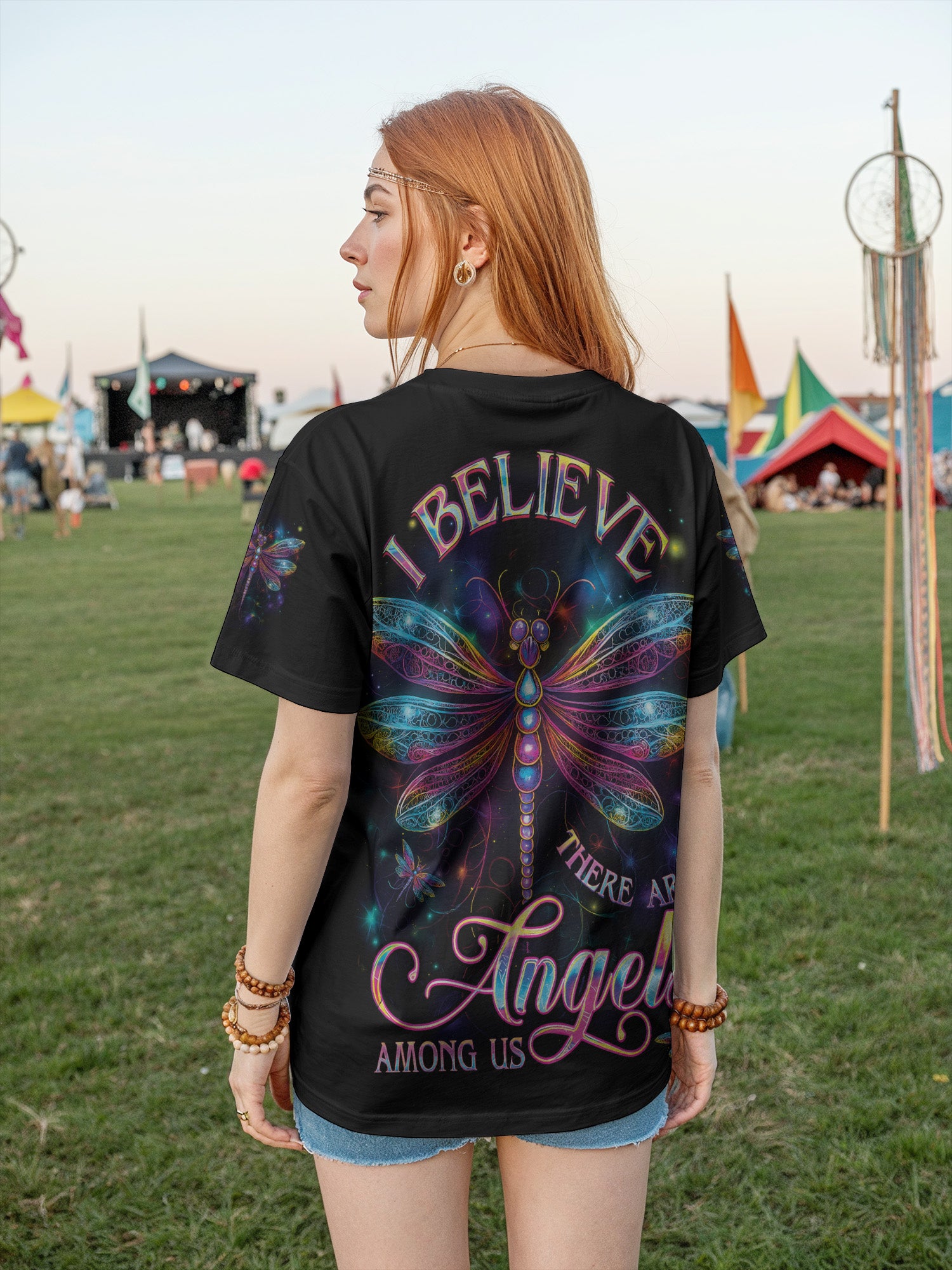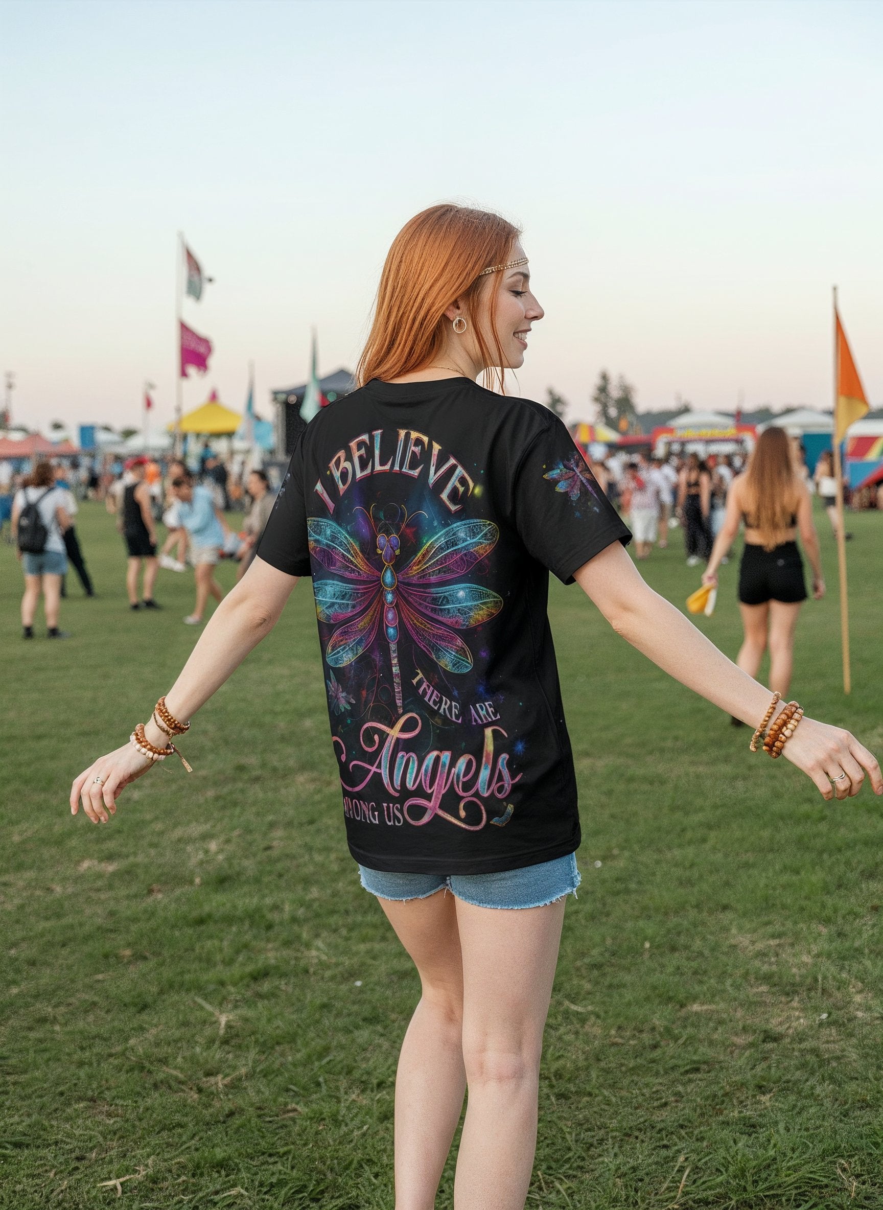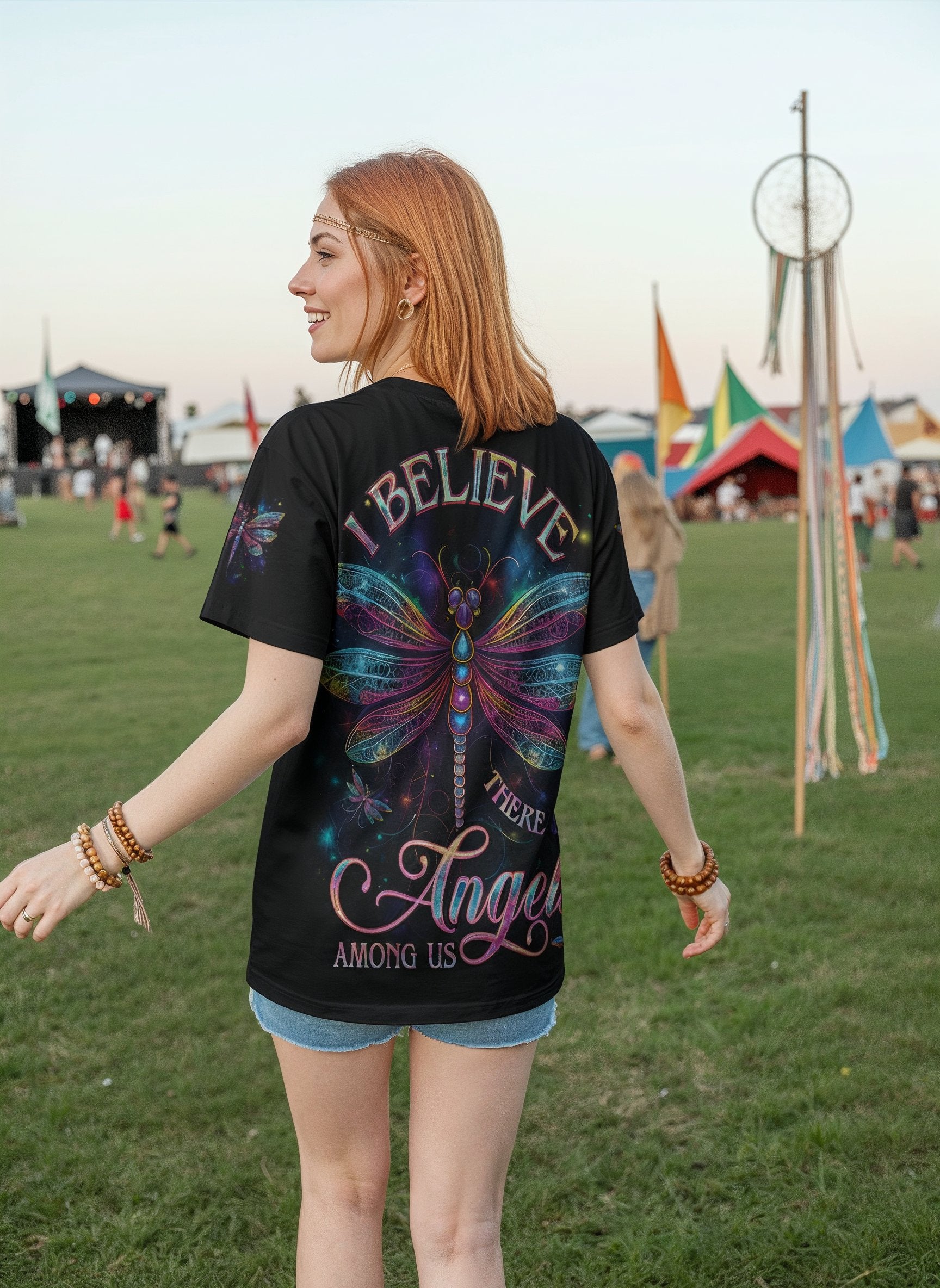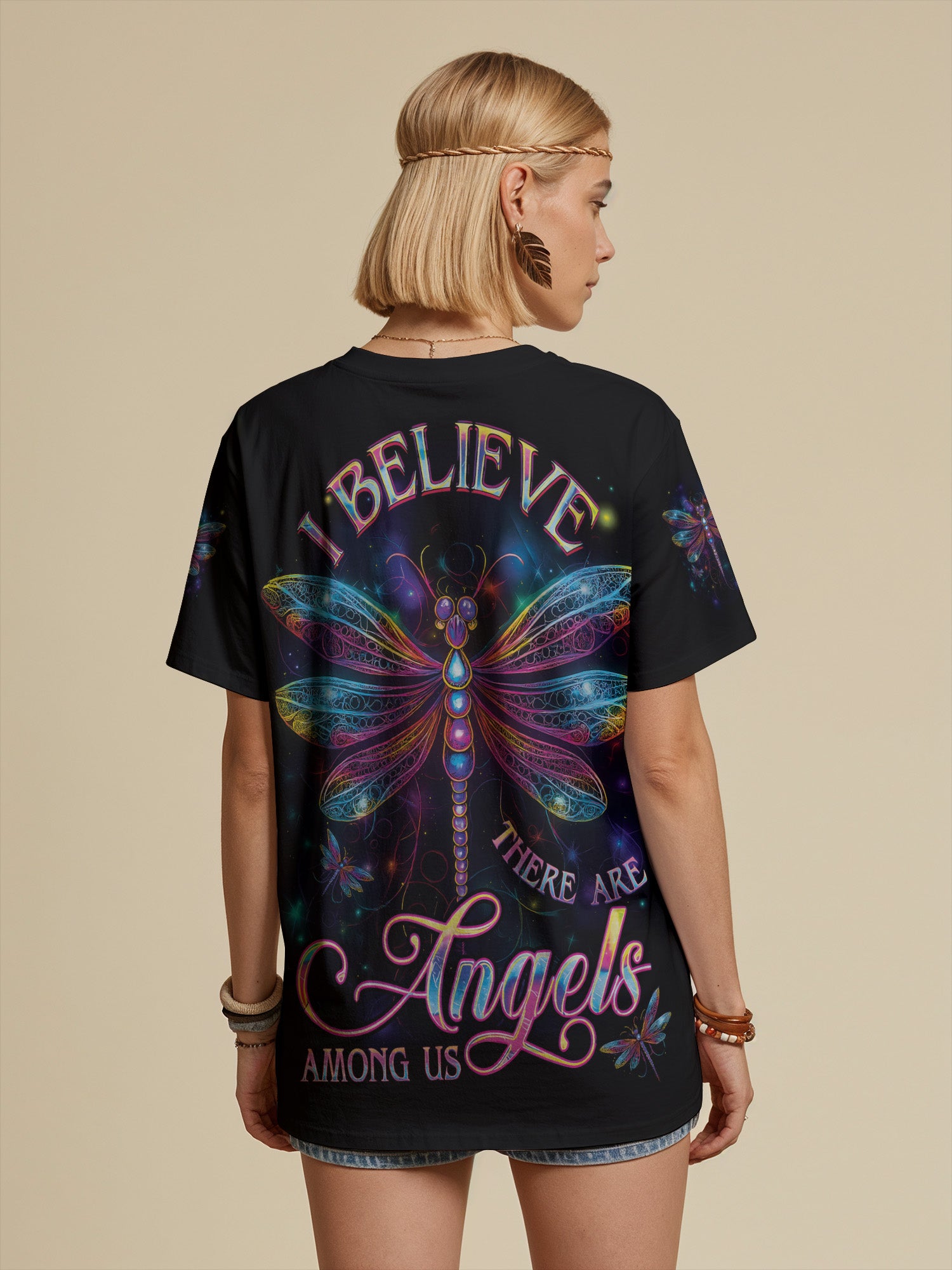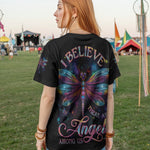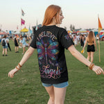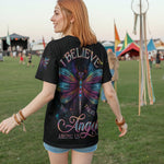 Step into cosmic serenity with the Angel Wing tee. Featuring radiant dragonfly wings that shimmer like stardust and the uplifting message “Believe, There Are Angels Among Us”, this all-over print design celebrates faith, light, and freedom.