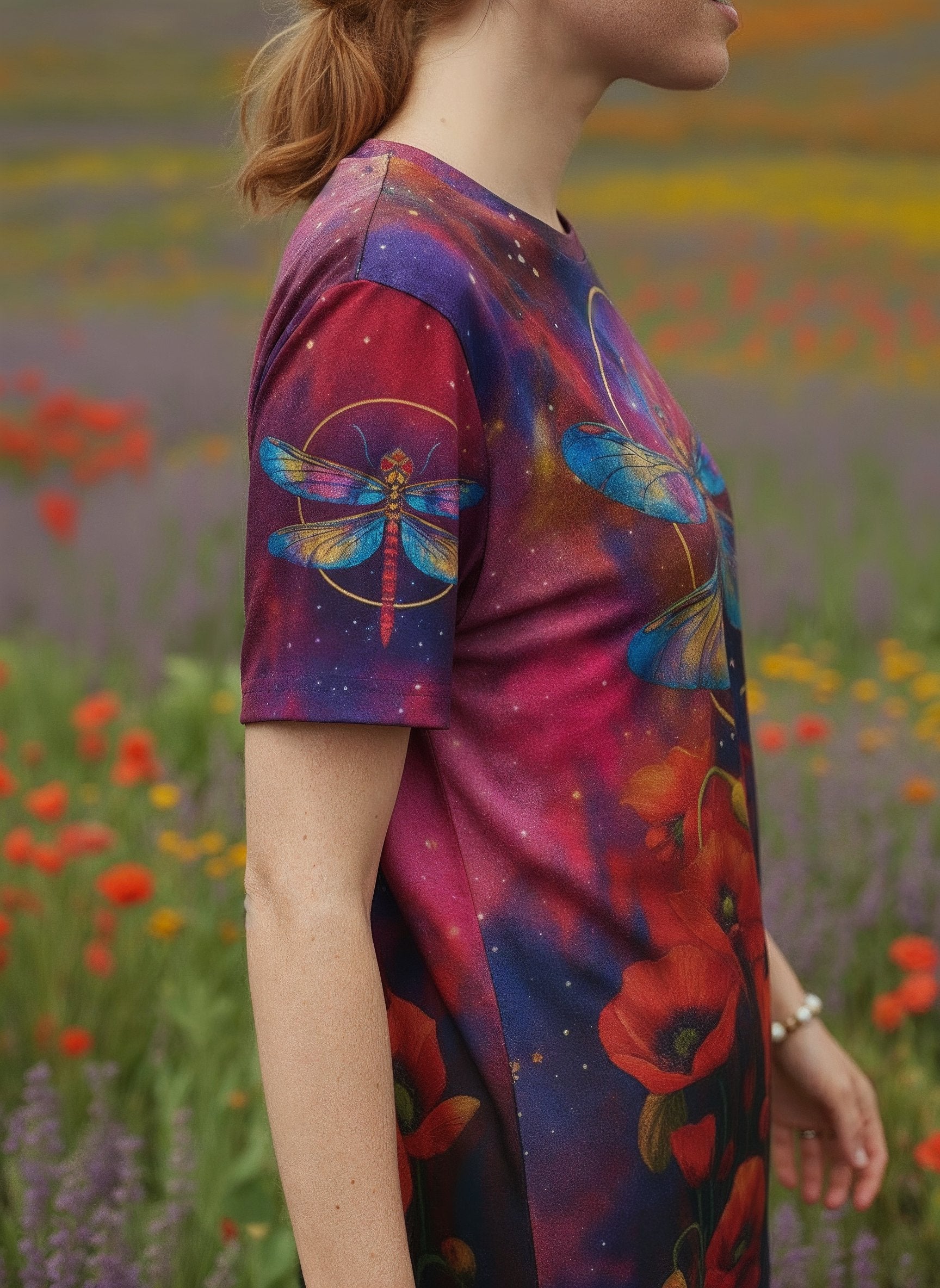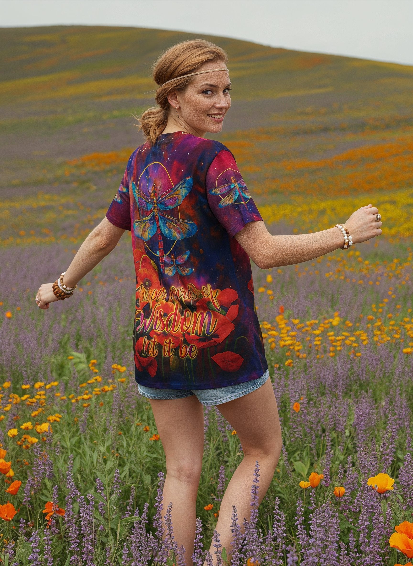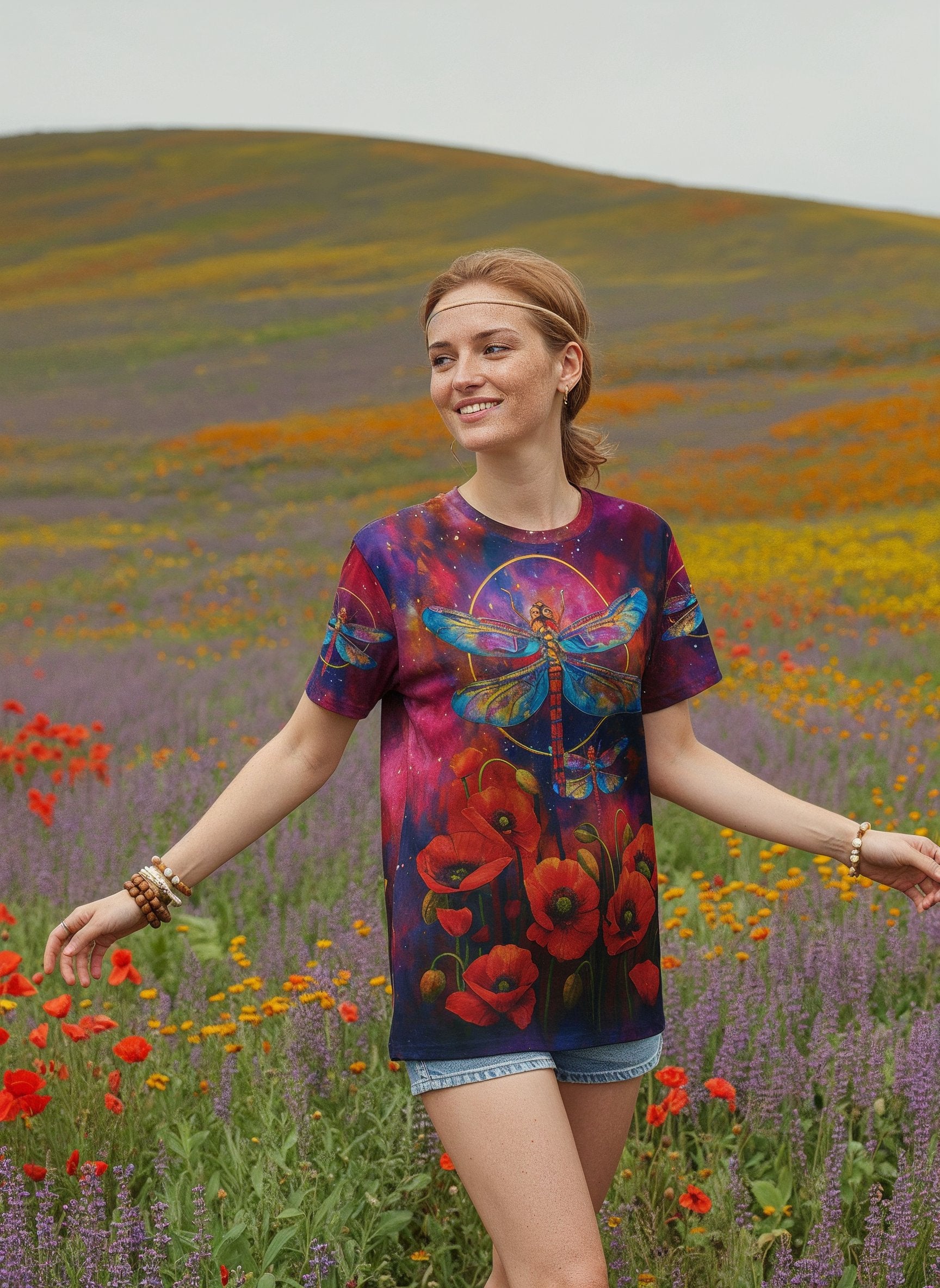 Step into the flow of the universe with Wingborn. Featuring radiant dragonflies rising above fiery poppies against a dreamy galaxy sky, this tee carries the essence of transformation and hippie soul. Crafted with vivid all-over-print and breathable fabric, it’s your perfect companion for starlit nights, sunny days, and every free-spirited adventure.