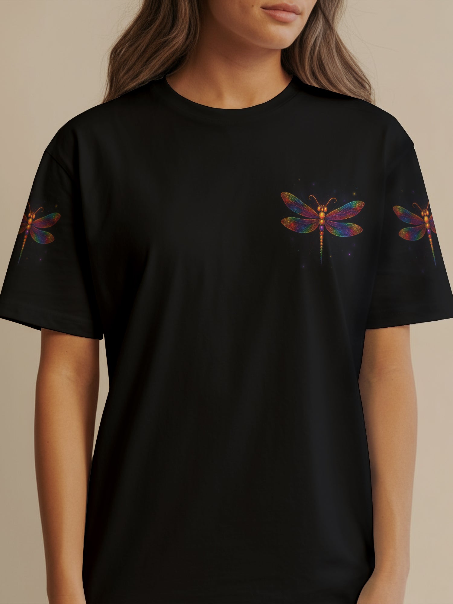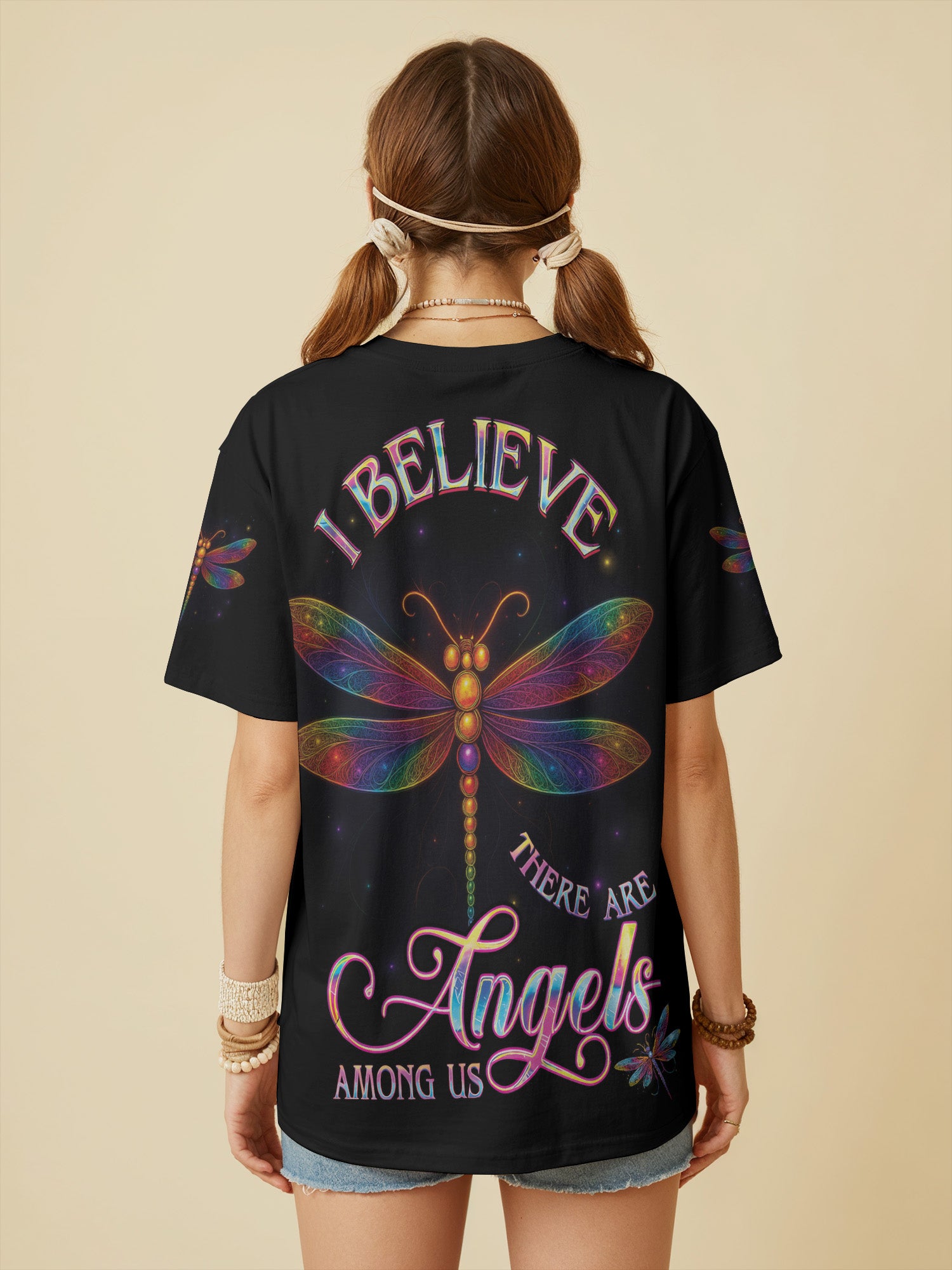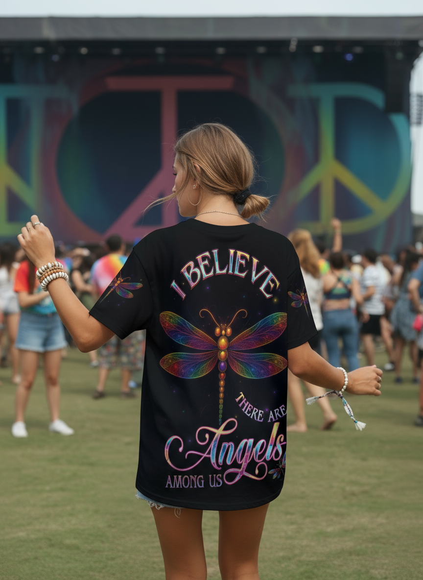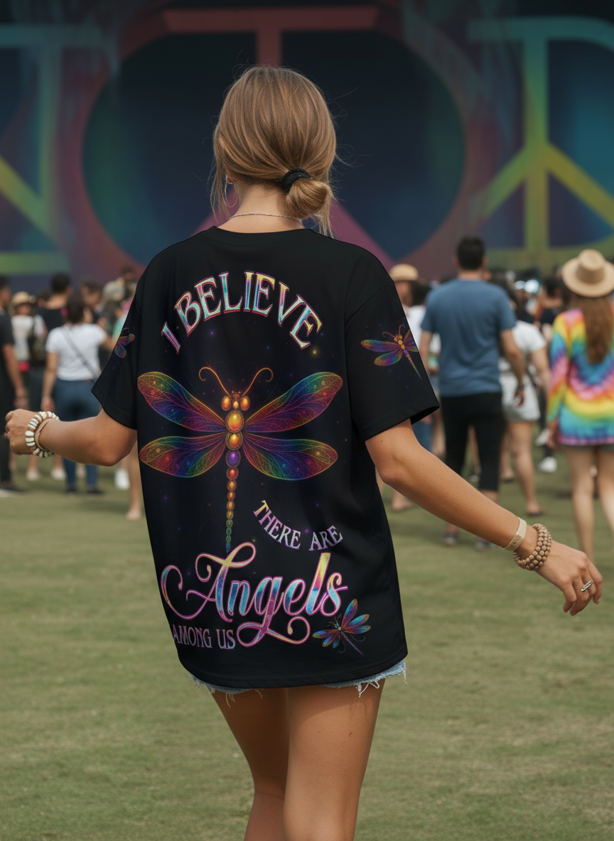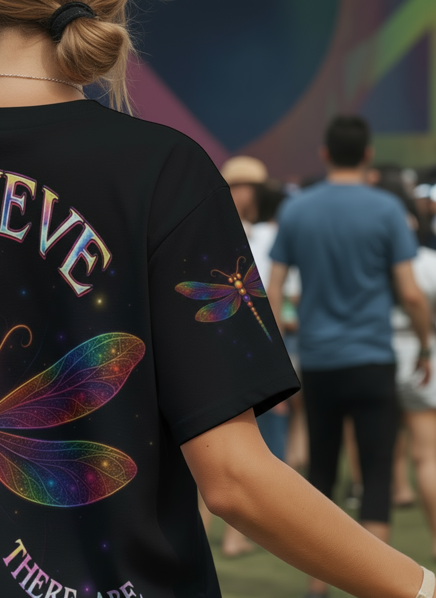 Find your peace in the cosmos with the Elysium all-over print shirt. Shimmering dragonfly wings unfold across a starlit sky, carrying the message “Believe, There Are Angels Among Us”. A symbol of hope, freedom, and eternal light, this design is made for hippie souls who dream beyond the ordinary and embrace the beauty of the unseen. Wear it as your gateway to serenity and celestial vibes.