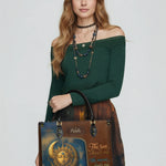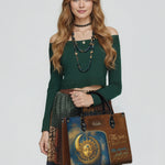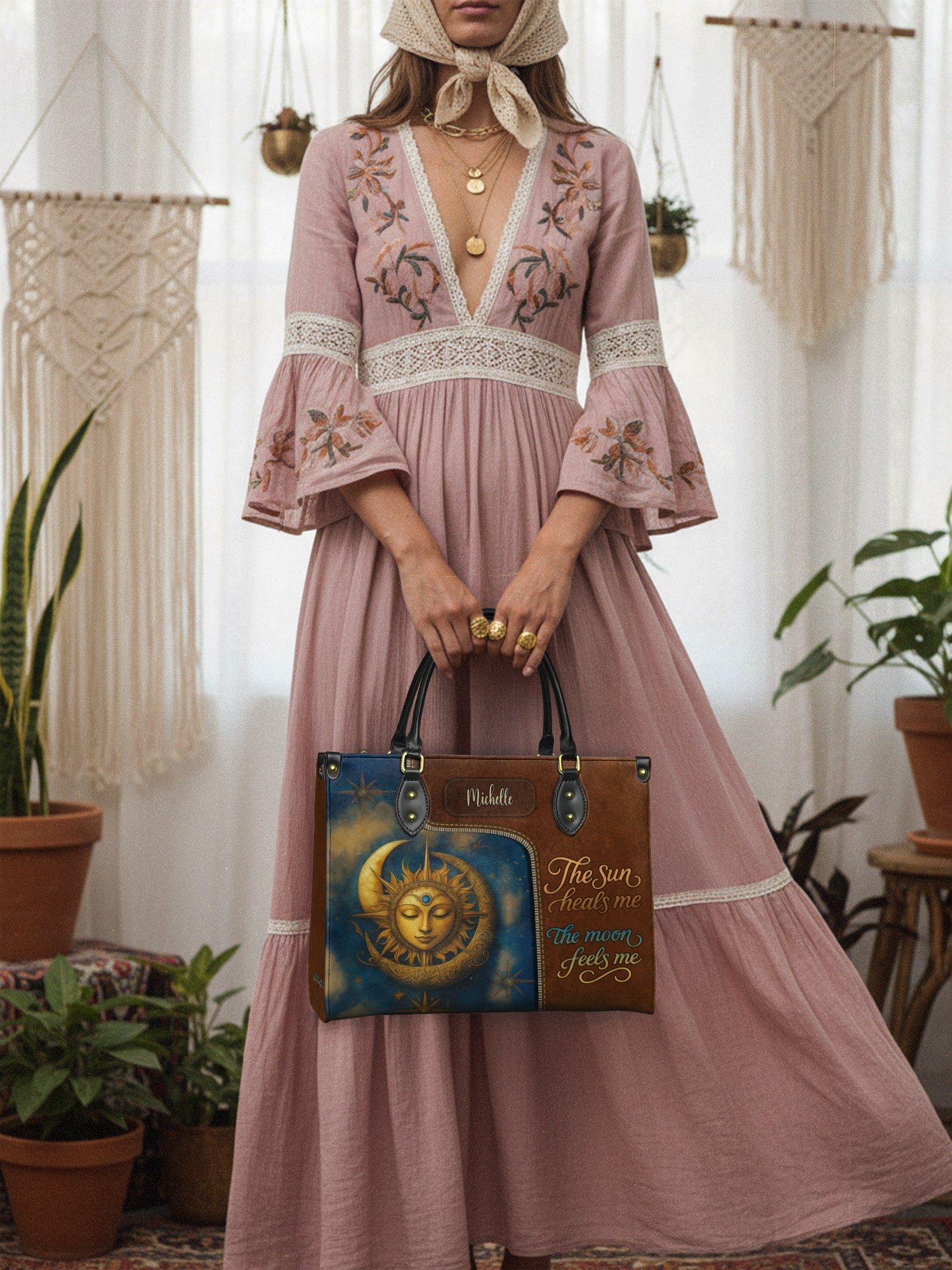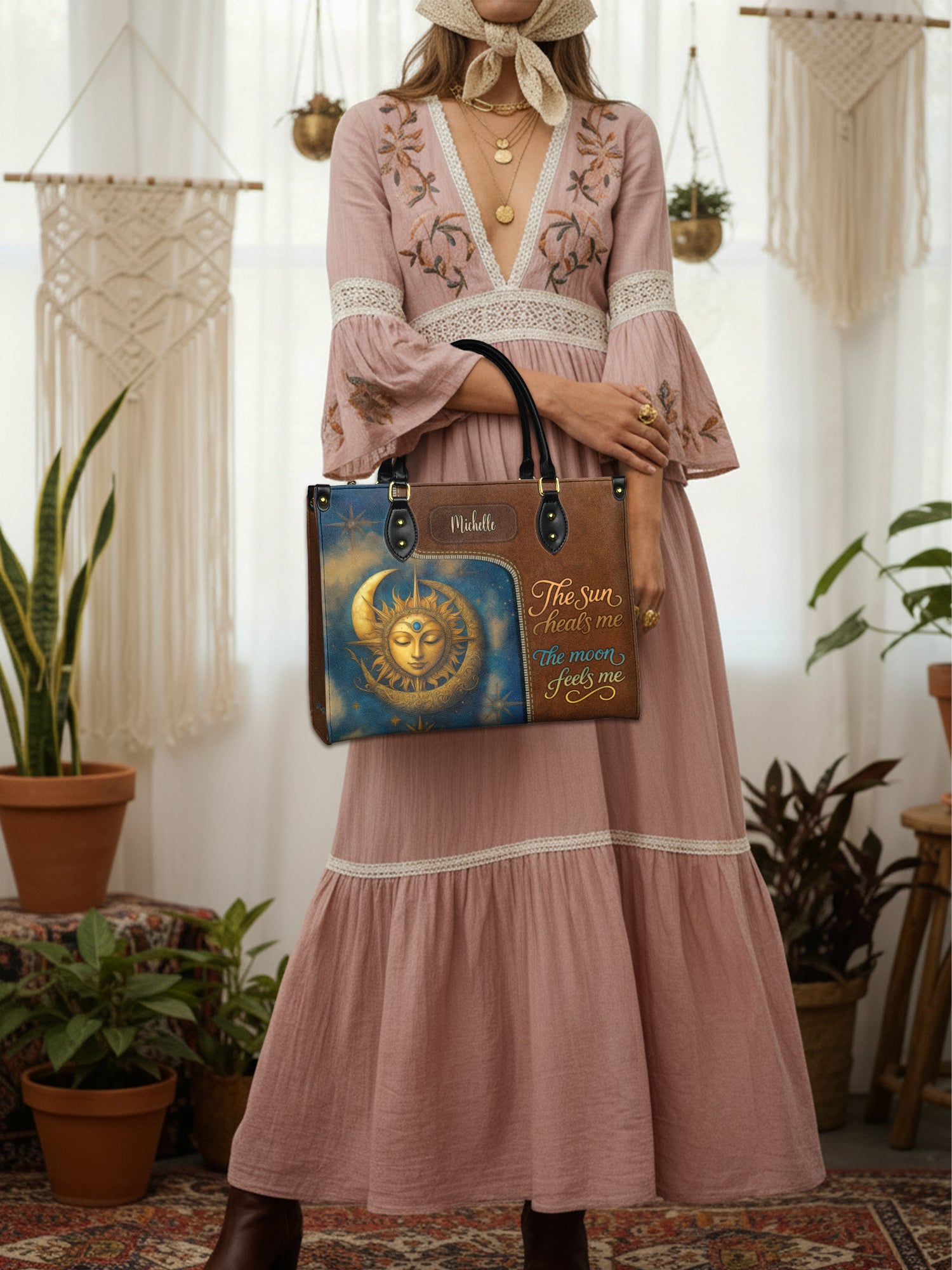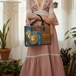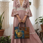 This handbag is soft leather embodying the free spirit, spacious enough to carry essential items like philosophical works or notebooks for creative expression , and a 13'' laptop or tablet, mala beads and healing stones , along with round-framed sunglasses , even a small musical instrument (like a harmonica or flute) to inspire spontaneous creativity.