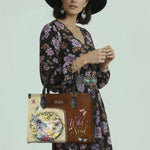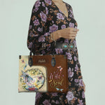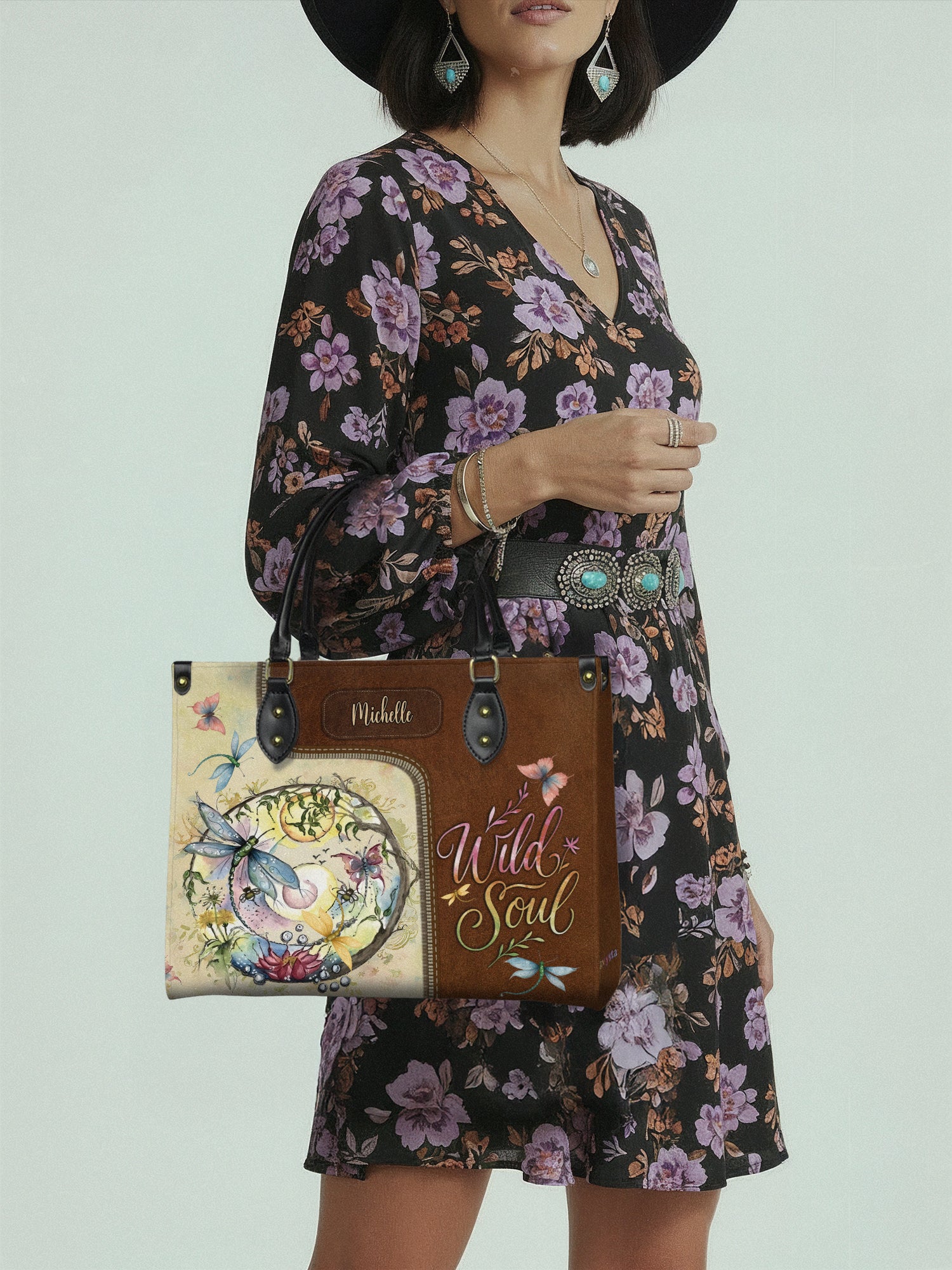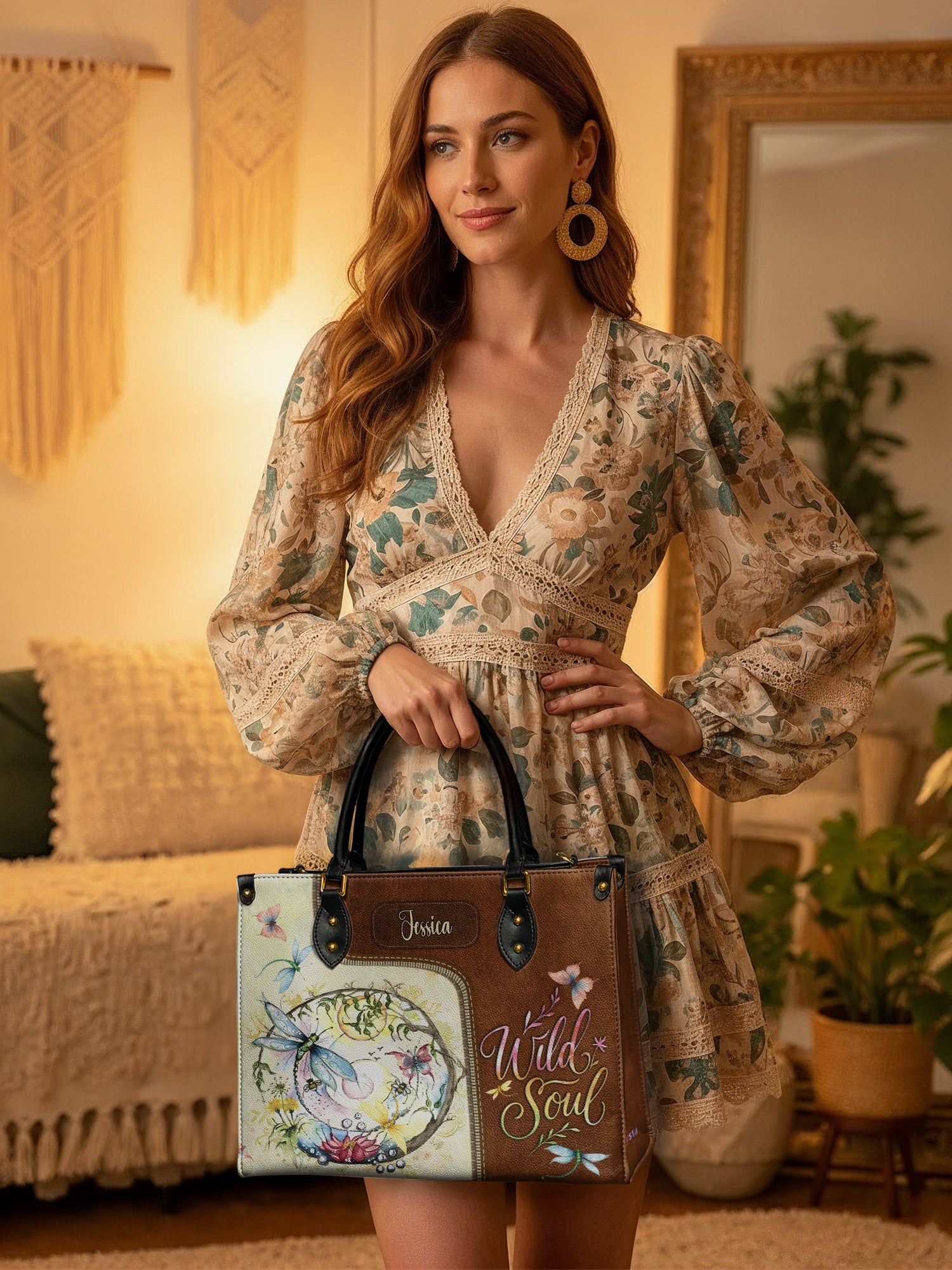 This handbag is soft leather embodying the free spirit, spacious enough to carry essential items like philosophical works or notebooks for creative expression , and a 13'' laptop or tablet, mala beads and healing stones , along with round-framed sunglasses , even a small musical instrument (like a harmonica or flute) to inspire spontaneous creativity.