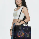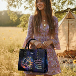 This handbag is soft leather embodying the free spirit, spacious enough to carry essential items like philosophical works or notebooks for creative expression , and a 13'' laptop or tablet, mala beads and healing stones , along with round-framed sunglasses , even a small musical instrument (like a harmonica or flute) to inspire spontaneous creativity.