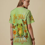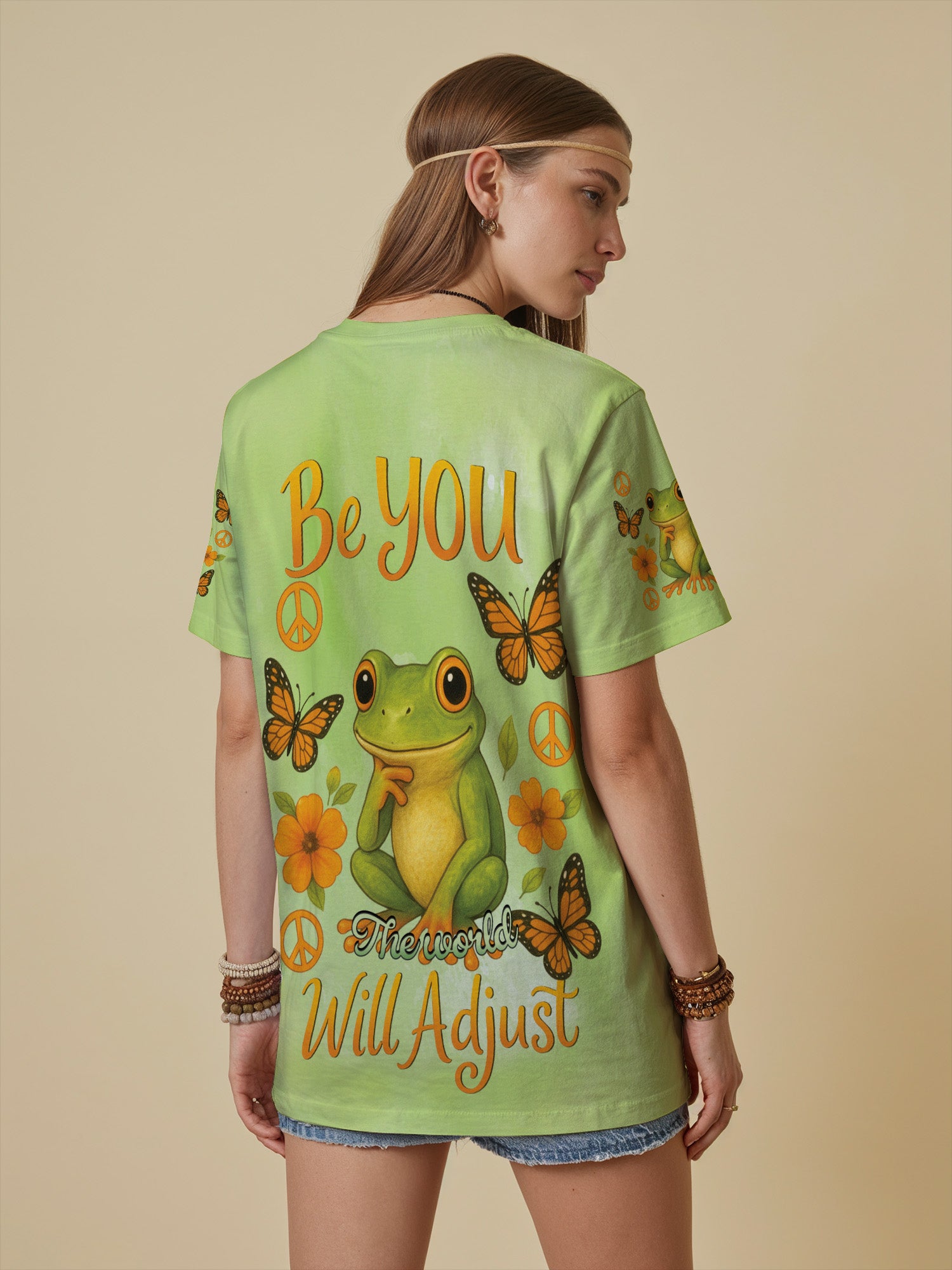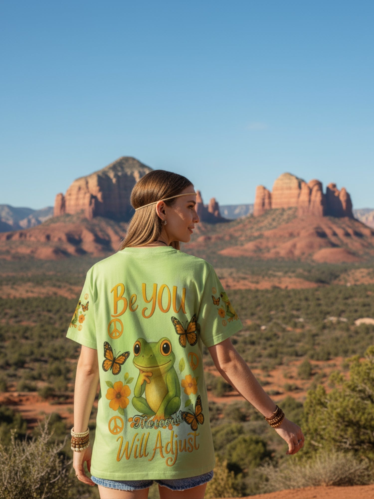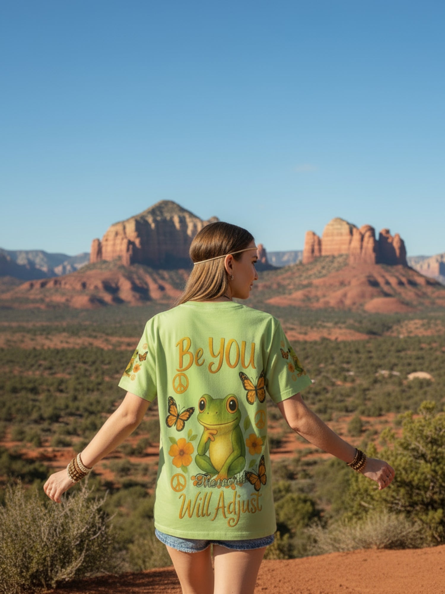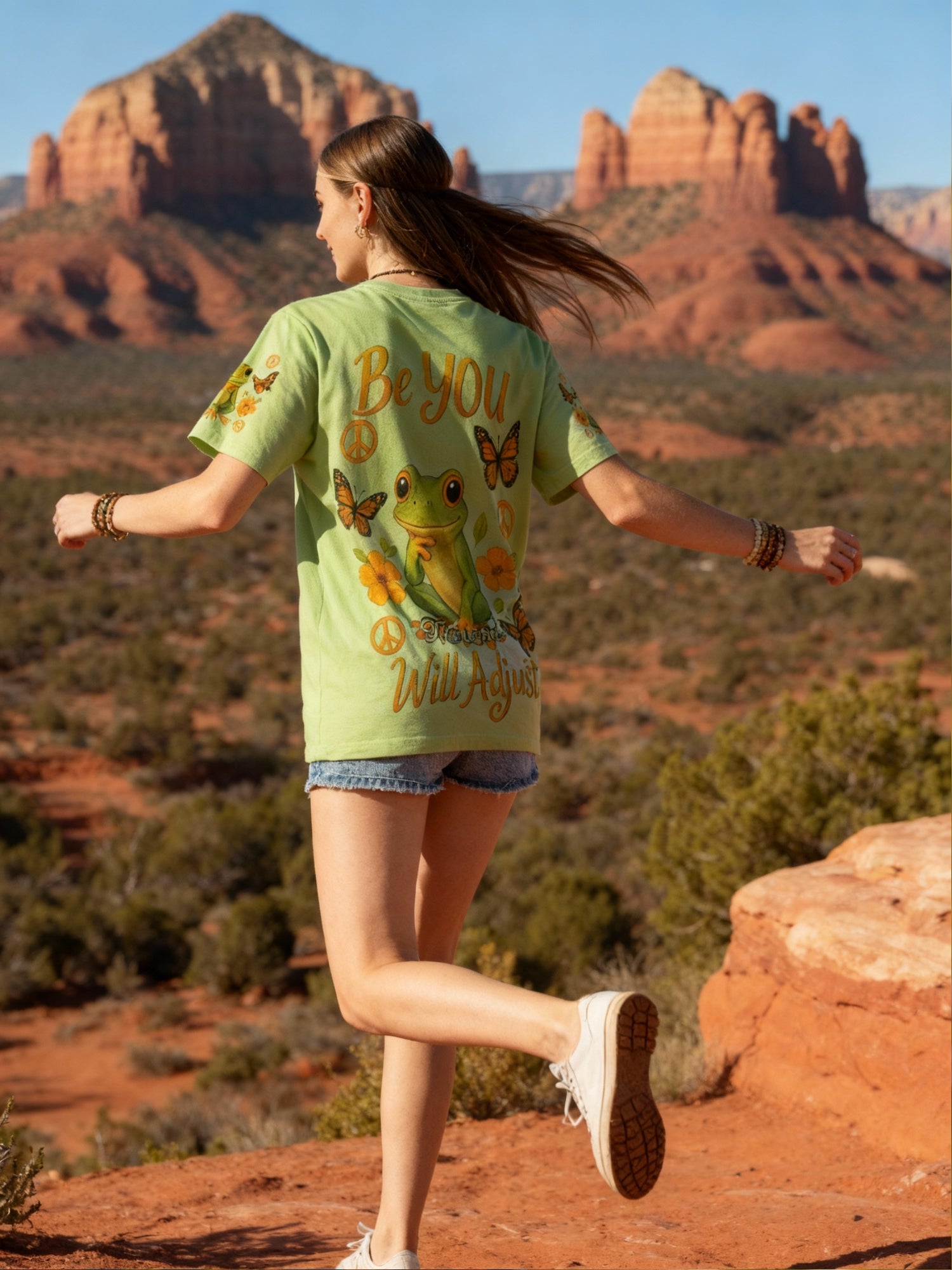 With the uplifting mantra “Be you, the world will adjust”, this shirt celebrates individuality and groovy self-expression. Made with soft, all-over print fabric, it’s perfect for festivals, adventures, or simply radiating peace and joy every day.
