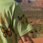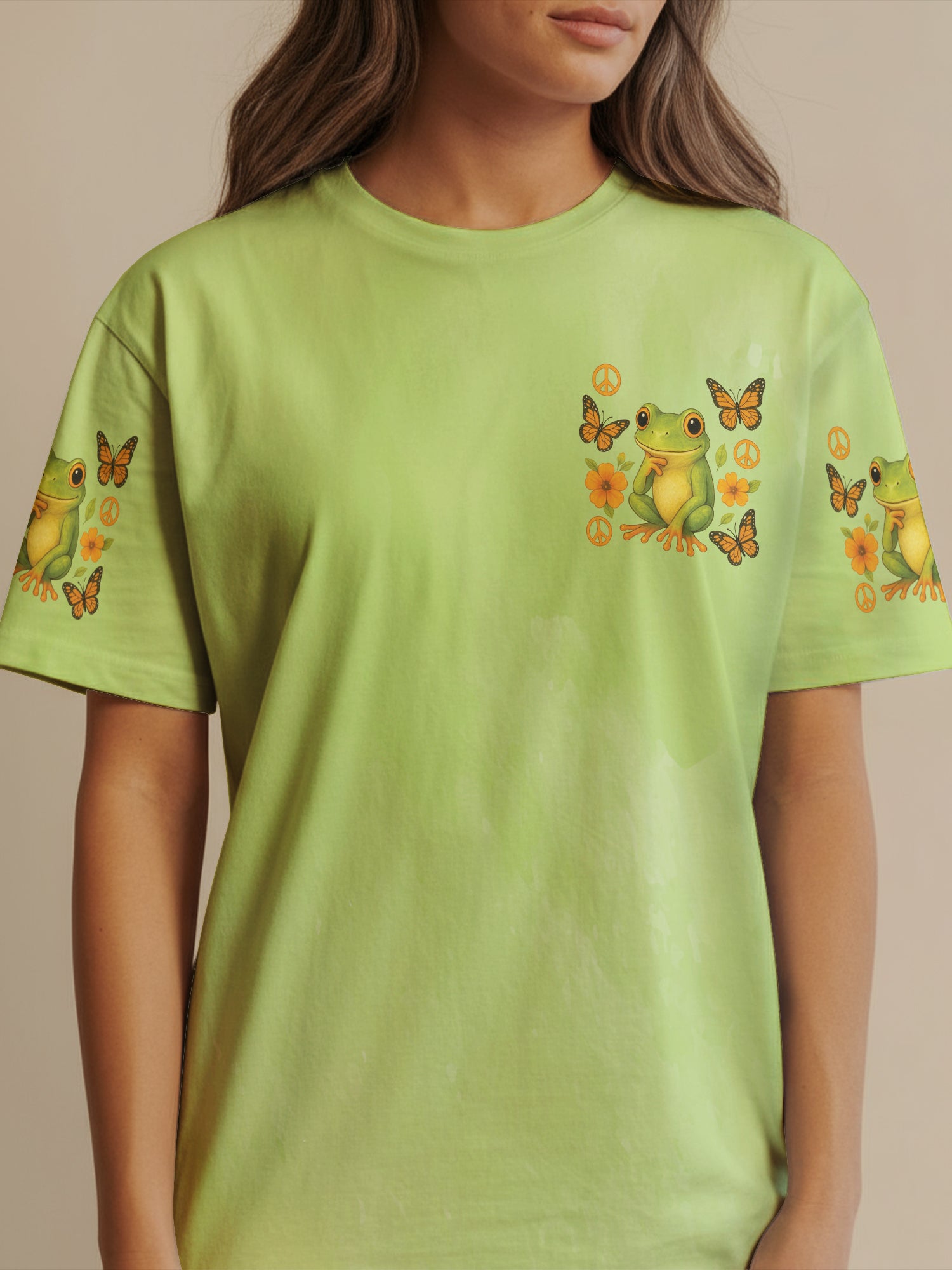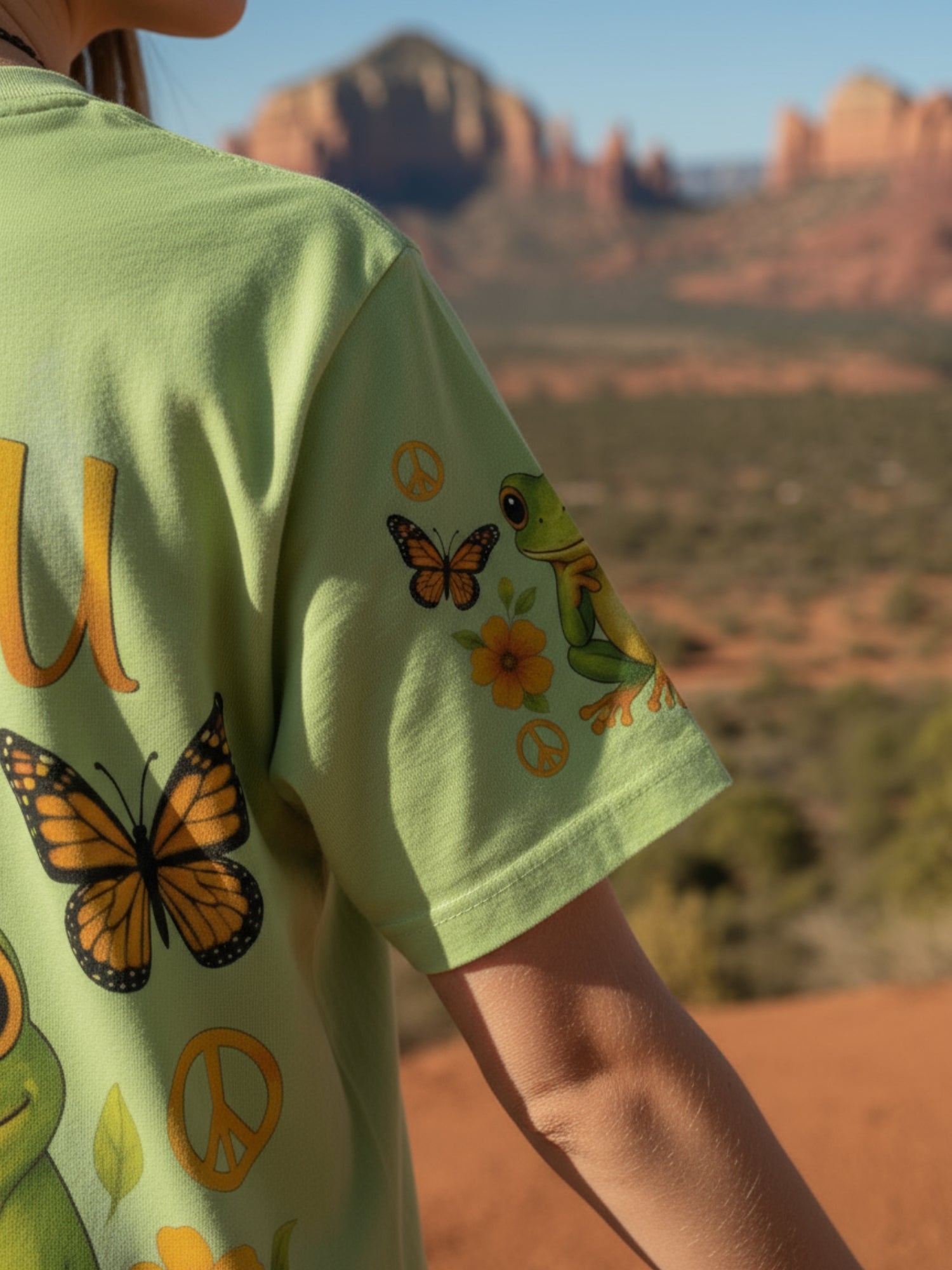 Step into carefree vibes with the Stay Groovy Frog tee. Featuring a chill frog surrounded by sunflowers, butterflies, and peace signs, it’s a playful ode to freedom and nature.
